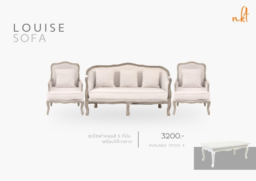 เช่าโซฟาแบบ 5 ที่นั่ง โซฟาหลุยส์ พร้อมโต๊ะกลาง [โซฟา 3 ที่นั่ง 1 ตัว กับ โซฟา 1 ที่นั่ง 2 ตัว] | 3200 |