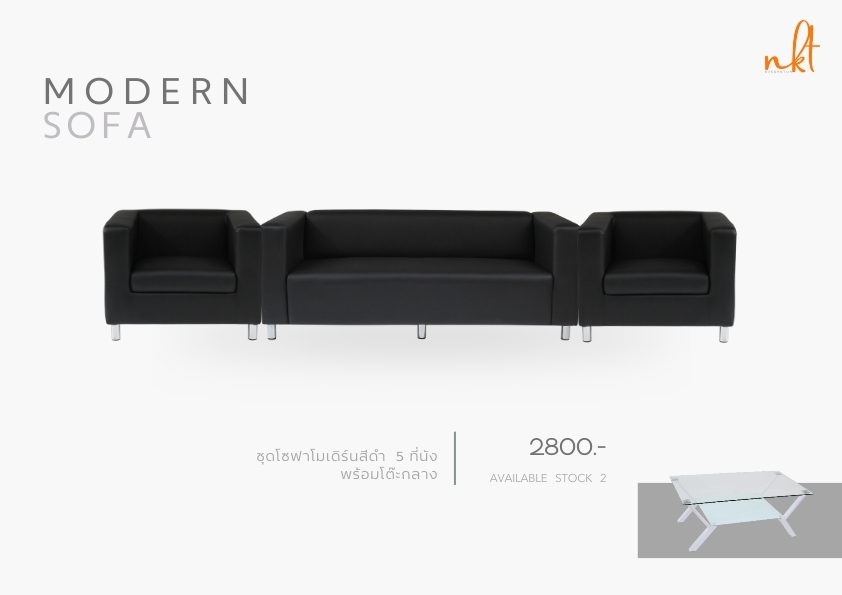 เช่าโซฟาสีดำ เต็มชุด 5 ที่นั่ง พร้อมโต๊ะกลาง [โซฟา 3 ที่นั่ง 1 ตัว กับ โซฟา 1 ที่นั่ง 2 ตัว] | 2800 |